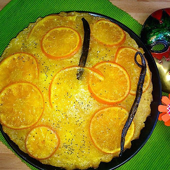 Pour the cake mixture over the oranges and bake about 40-45 minutes, or a skewer comes out clean.